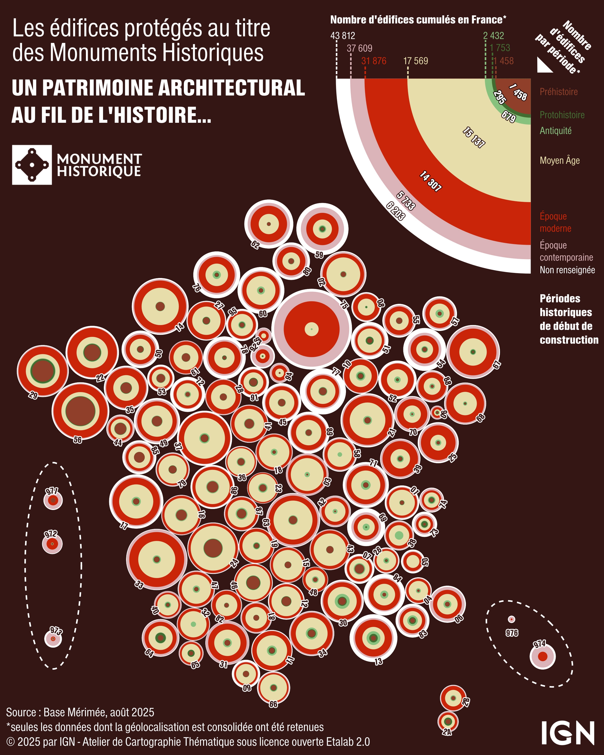 En France, la première pierre posée de ces édifices l'a été en grande majorité au Moyen-Âge (500 à 1500 après JC) ou à l'époque moderne (1500 à 1789). Le patrimoine préhistorique est présent de manière significative sur une diagonale reliant la Bretagne au sud du Massif central. Le patrimoine antique (-50 à 500), quant à lui, est très concentré le long du pourtour méditerranéen. Enfin, le patrimoine contemporain (1789 à 1999) se situe en majorité en Île-de-France, dans les Hauts-de-France, et dans les DROM.